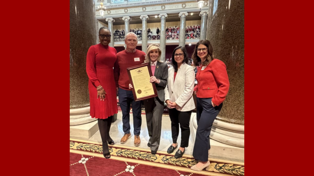 State Advocacy Committee members Kaala Berry, Dan Martin, Dr. Deepa Mokshagundam, and Megan Jensen joined Representative Sherri Gallick on February 25 for the presentation of the Missouri House Heart Month Proclamation. Representative Gallick championed last year’s Cardiac Emergency Response Plans bill, making this moment especially meaningful for our volunteers and advocacy team.